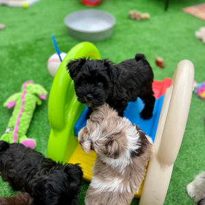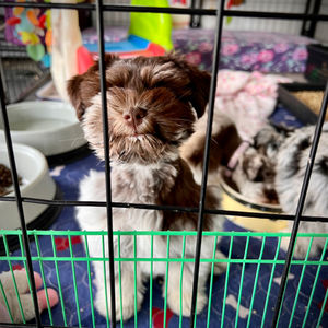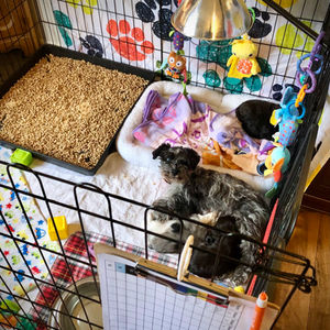 One of the biggest questions we get is, "How or where is my puppy raised?" Let me take a little time to show you. First and foremost, we believe in letting our dogs be dogs. We feel it's extremely important for both their physical and emotional needs to be met on a daily basis. This means our dogs do NOT live in no-contact kennels! Yes, we kennel our dogs at night for their safety and my sanity. We let our dogs run and play and come in and out as they please during the day. Our adult dogs have their own "dog room," and our mommas all whelp and raise their pups in our dining room. Once we start potty training, our pups move to our "dog room" where they learn how to use the litter box and doggy door. Though all of our adults are current on all their yearly vaccinations and boosters, we still do not allow our pups on real grass until they have had at least their first set of vaccinations. Instead, we have turf play yards set up for them until they are old enough. All of our adults are given both low-fat kibble and fun raw toppers like fresh goat's milk, eggs, and beef. Our moms are all on a higher protein kibble along with vitamins and goat's milk daily. We feel prenatal care is extremely important and take pride in knowing we give our pups the very best start before they are even born.